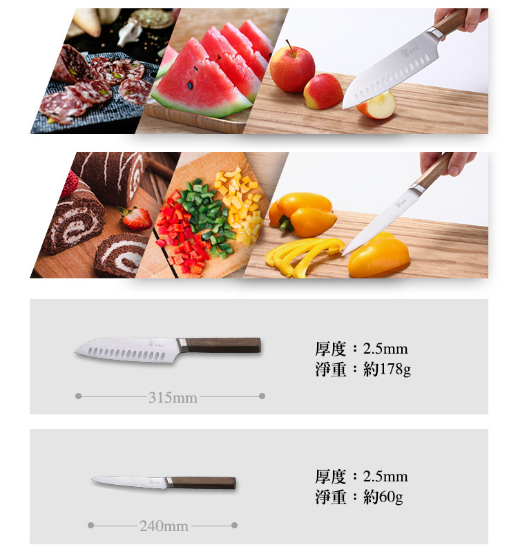一體成型,堅固耐用 優質420不鏽鋼,耐磨、耐腐蝕性高 萬用刀適用於蔬菜、麵包、水果等較軟質食材切片調理 廚師刀適用蔬菜、肉品等較軟質食材切片調理