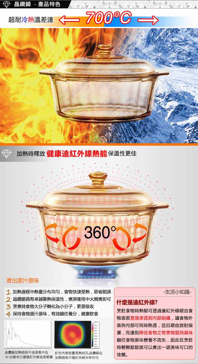 ●日本製,耐熱溫差達700℃ ●加熱時釋放遠紅外線熱能,保溫性更佳 ●鑽石切面鍋身及把手,非凡視覺享受 ●更輕薄、更耐熱、更有型 ●冰箱到火爐一鍋到底,省時省力 ●無毛孔,不留異味好清洗